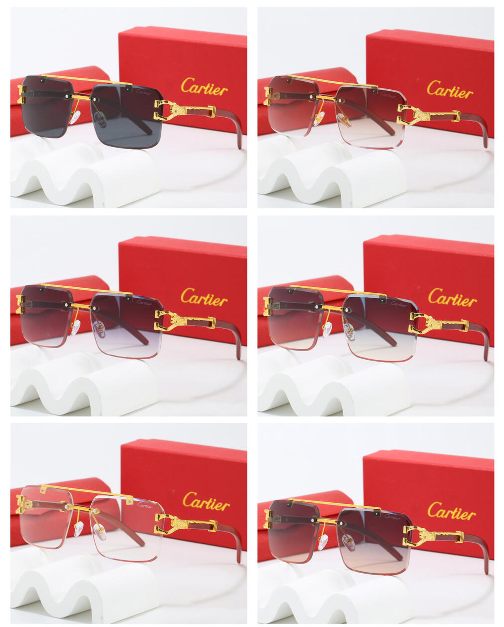 Frameless luxury eyewear with gold arm detail and Cartier branding. Lightweight build with prestige presence.Available in 6 colours — gradient tints, dark lens, and clear.ETA: 2–4 weeks | 50% deposit to reserve